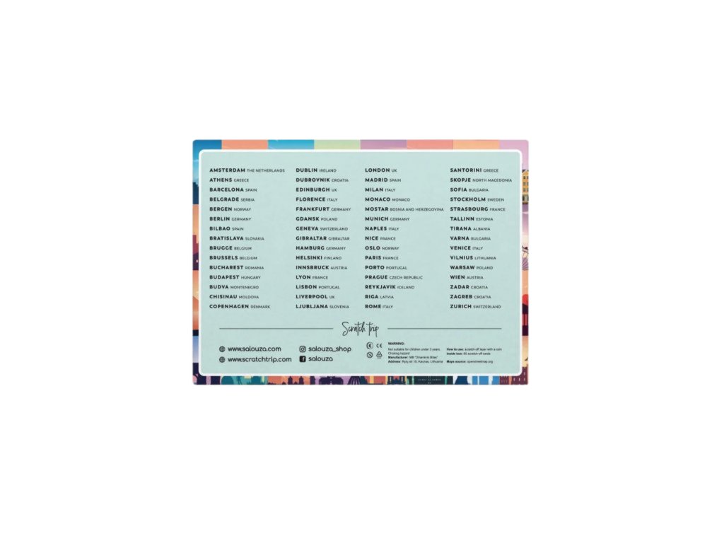 Originálne stieracie karty vám pomôžu zdokumentovať vaše cesty a uchovať dôležité spomienky z ciest. Tieto karty obsahujú 60 miest, pričom každé z miest obsahuje ďalších 10 miest a atrakcií, ktoré nemôžete vo vybranom meste vynechať. Je to skutočne ideálny cestovný doplnok pre tých, ktorí vždy túžia navštíviť nové vzrušujúce miesta a zároveň spomínať na svoje cesty nepretržite.